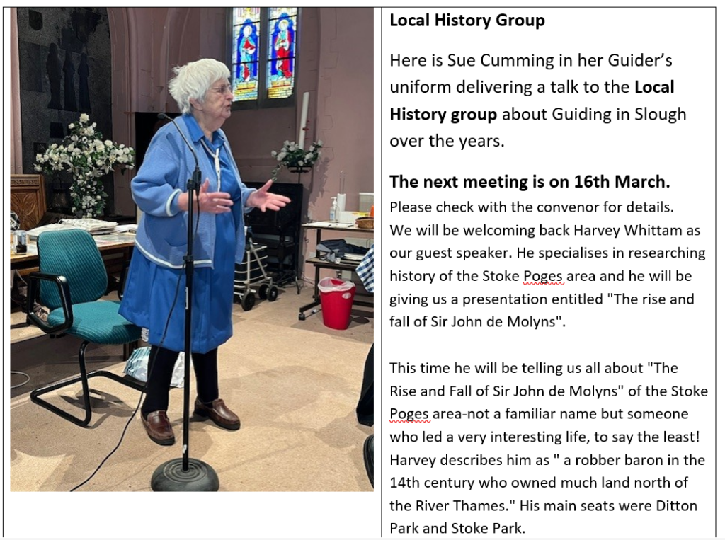 There were 18 of us present today to hear Harvey Whittam give a very interesting talk about the rise(s) and fall(s) of Sir John de Molyns who was a 14th century Baronet and Knight who owned the land of many parishes including Stoke Poges, Ditton, Fulmer and Denham, to name just a few.